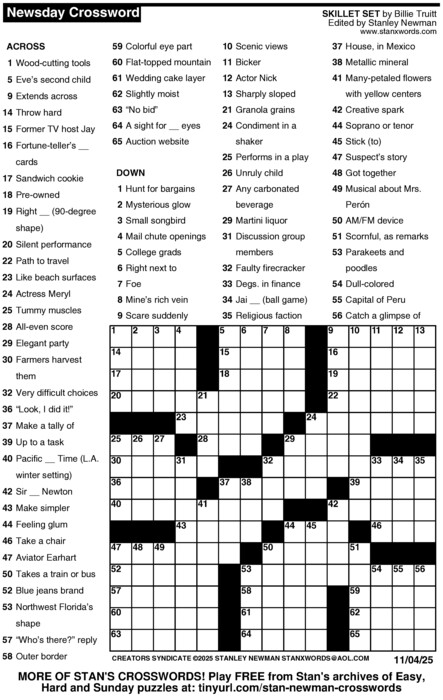 Because free access to the content of Newsday.com is available only to Newsday subscribers and customers of Cablevision (Newsday’s owner), many thousands of puzzle fans, spanning six continents, get the Newsday Crossword free every day right here at Stan’s Crossword Land.