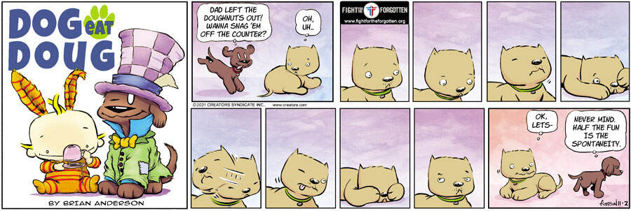 Written and illustrated by Brian Anderson, Dog Eat Doug began in 2004 as a webcomic. but in November 2005 it was picked up for syndication by Creators Syndicate.